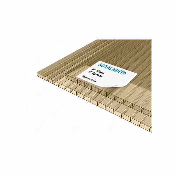 Сотовый поликарбонат 10 мм SOTALIGHT бронза 2100х12000 мм - это прочный и легкий материал, который отлично подходит для использования в различных строительных и дизайнерских проектах. Поликарбонат обладает высокой устойчивостью к ультрафиолетовому излучению, а также к ударным нагрузкам, что делает его идеальным выбором для создания надежных и долговечных конструкций.